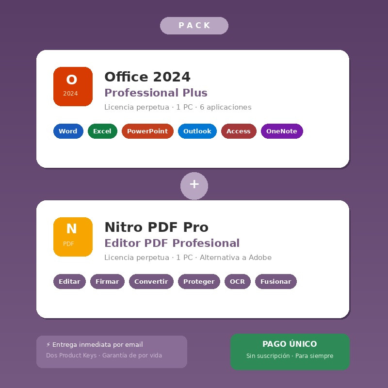 Este pack combina la suite de oficina mas completa de Microsoft con el editor de PDF profesional mas popular del mercado. Recibes dos licencias permanentes independientes a un precio inferior al de compra por separado.